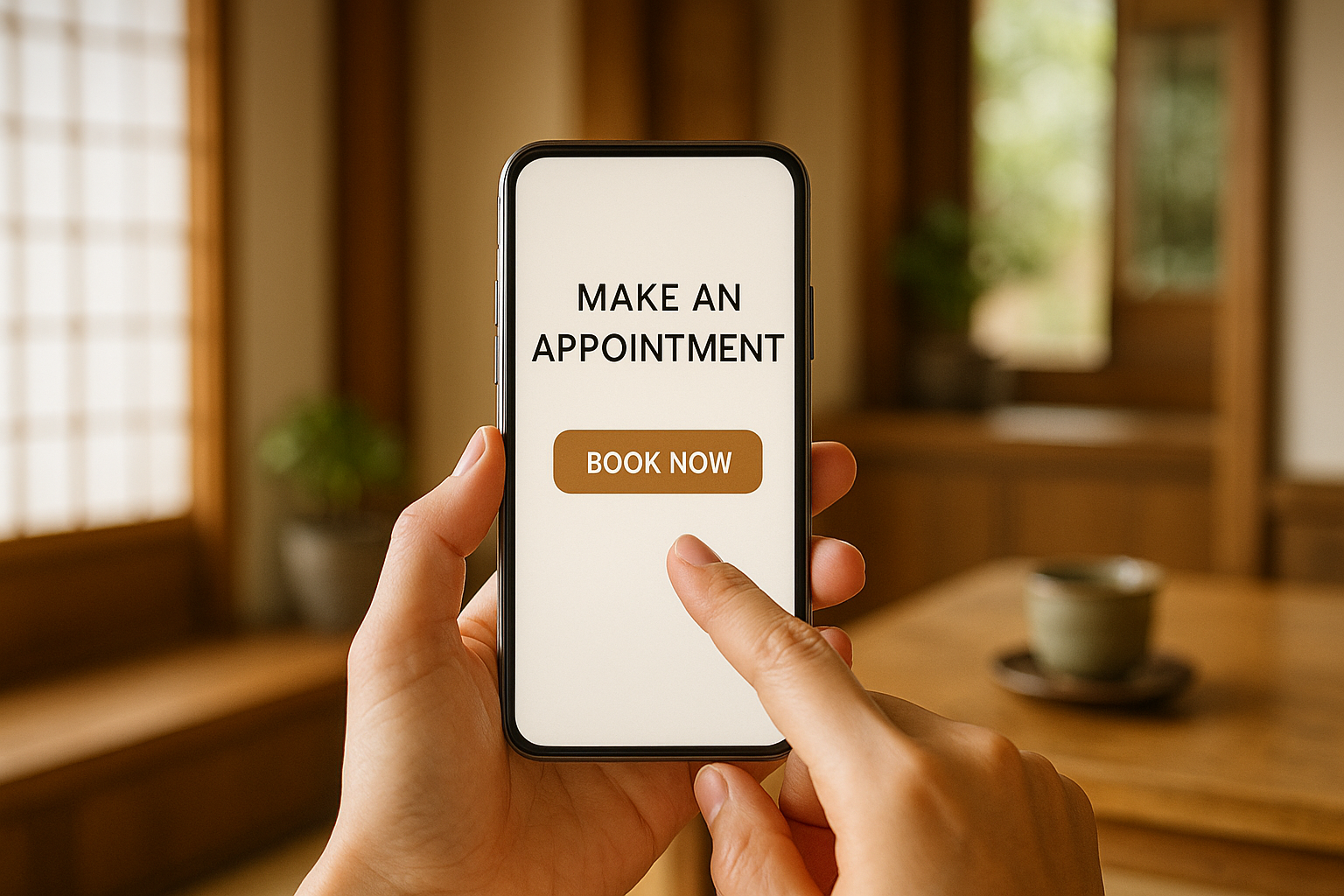 まずはお電話(090-9717-5509)、LINE、またはウェブサイトのフォームからご予約ください。LINEおよびサイトからのご予約は24時間受け付けております。※お返事は営業時間内となります。