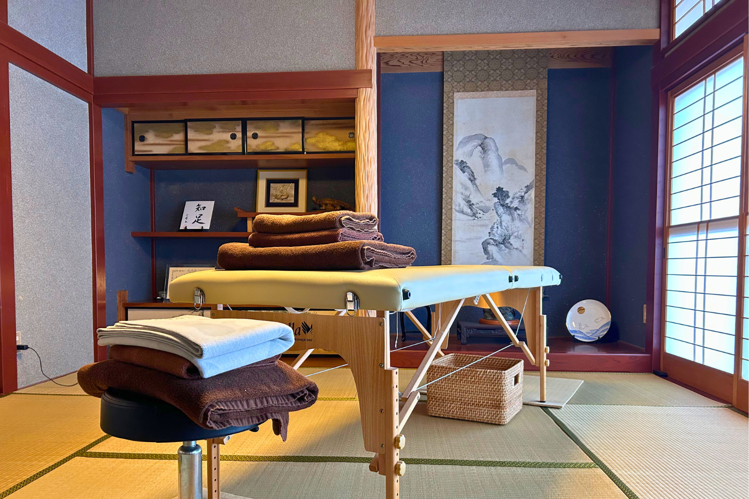 当院の施術室は、築100年以上の総欅(けやき)造りの古民家の8畳間一室。
